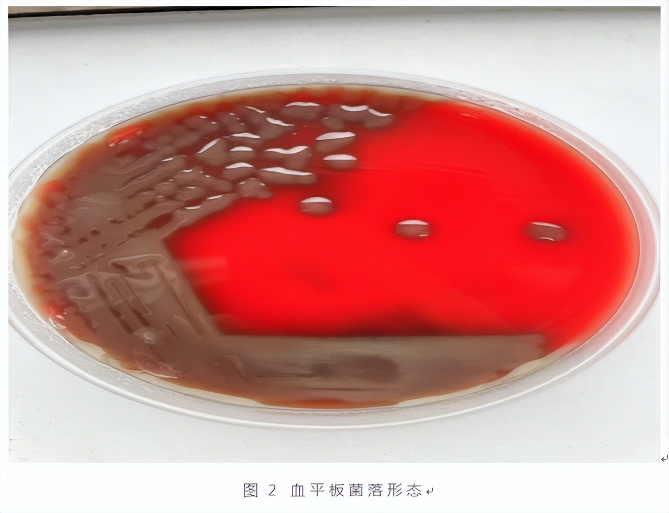 将报阳血液接种培养15小时后,血平板上可见湿润的、有草绿色溶血环的粘液型菌落(图2)。