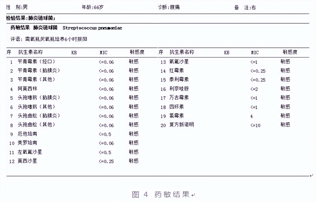 微生物室将血培养鉴定及药敏结果立即报告临床,在临床药师指导下,医生依据药敏结果调整用药方案,在原用药方案的基础上加强抗链球菌治疗。调整治疗方案后,患者感染指标均有下降趋势,其中白介素6下降最为明显,从入院时的90.76pg/mL下降至28.13pg/mL,患者症状明显好转,临床治疗有效,各项指标结果均正常,康复出院。