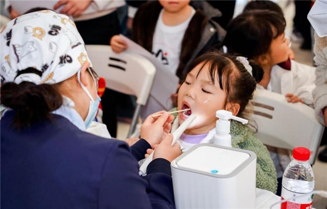 此外,活动现场还设有四大互动体验区,免费口腔检测区、口腔知识展示与绘本阅读区、刷牙体验区以及冠军妈妈郭晶晶合照打卡区。孩子们在沉浸式互动中增强防龋意识,现场口腔医生也为每位儿童提供免费检测与个性化护理建议。活动还向2至12岁儿童捐赠了专业口腔护理“爱牙包”,帮助孩子们建立日常护齿习惯。